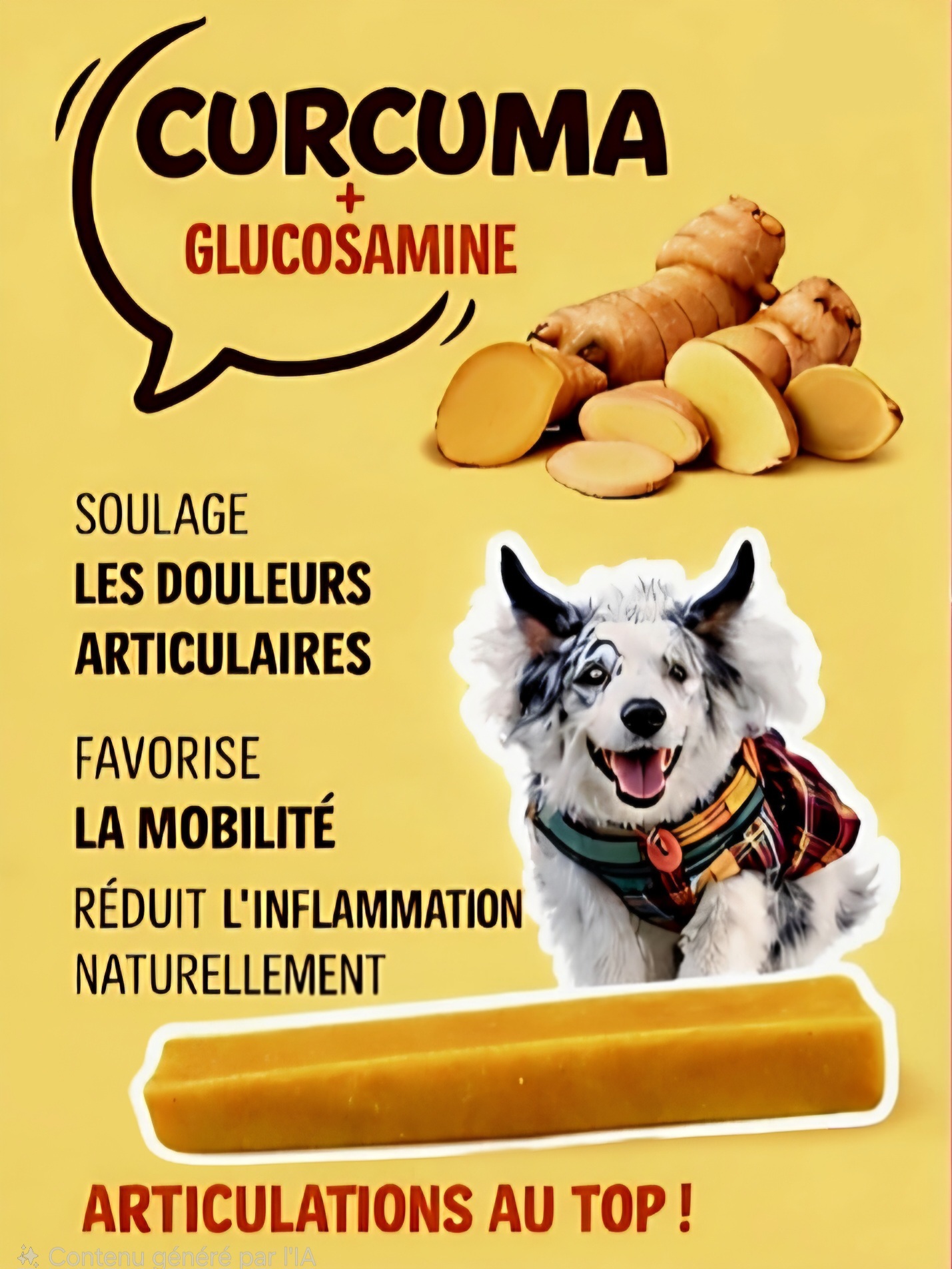 Une combinaison idéale pour accompagner les chiens actifs ou vieillissants. Le curcuma est apprécié pour ses propriétés naturelles, tandis que la glucosamine contribue au soutien des articulations et de la mobilité.