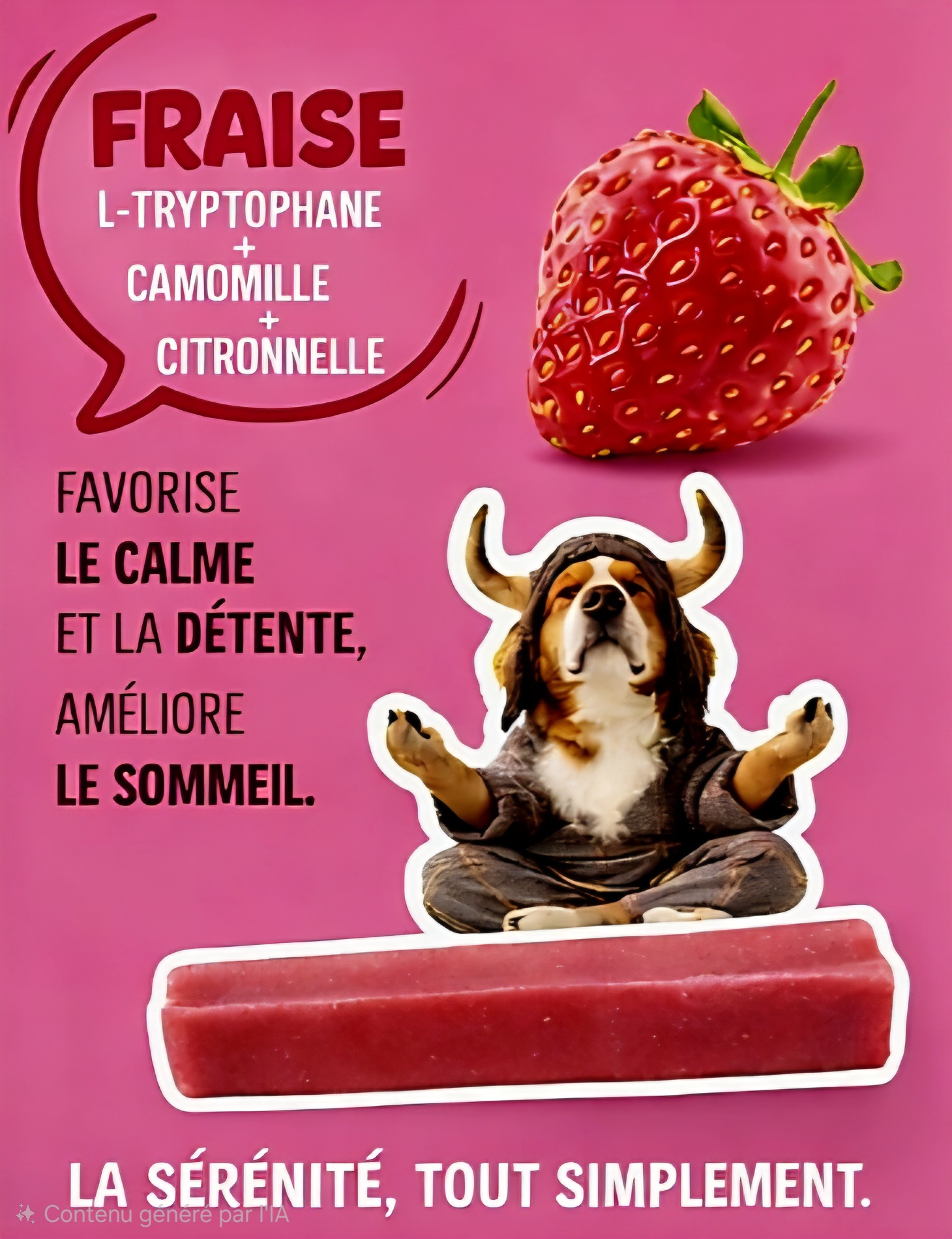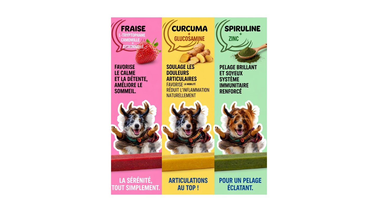 Une recette douce et équilibrée pensée pour favoriser la détente et le bien-être émotionnel de votre chien. L-tryptophane, camomille et citronnelle sont souvent associés à un effet apaisant, tandis que la fraise apporte une touche gourmande naturellement riche en antioxydants.